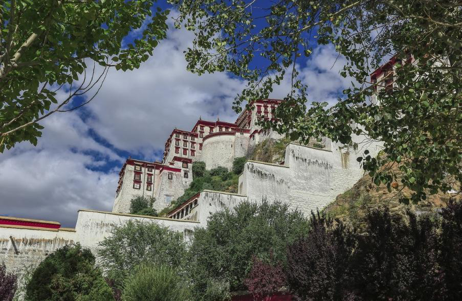 宮宇疊砌,迂回曲折,同山體有機(jī)地融合,這是布達(dá)拉宮給人最為直接的感受。其外觀有13層,自山腳向上,直至山頂。整體建筑主要由東部的白宮,中部的紅宮及西部白色的僧房組成。