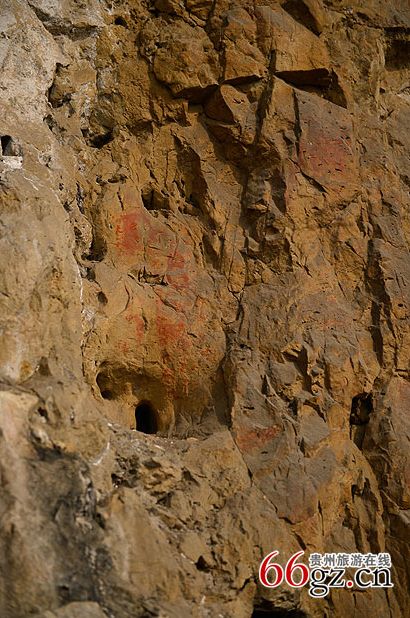 據(jù)資料載,金山洞古代崖畫以赭色涂繪人、馬、狗等等,隱約可見形態(tài)各異的大小圖像二三十個(gè)。人物多作行走狀,亦有雙手高舉者,似乎在祈禱。從其畫風(fēng)觀察,與相距不遠(yuǎn)的省級文物保護(hù)單位--長順龍家院崖畫十分相似。
